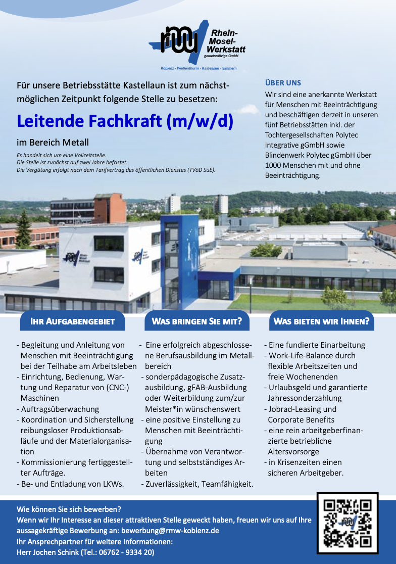 Wir suchen für unsere Betriebsstätte Kastellaun zum nächstmöglichen Zeitpunkt eine/einen: