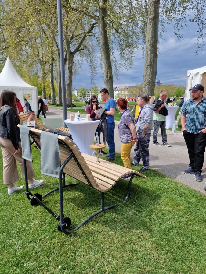 Stolz präsentierten Birgit Link und Thomas Römer die Eigenprodukte Rontondoliege und das Insektenhotel der Rhein-Mosel-Werkstatt auf der Koblenzer Gartenkultur 2023.